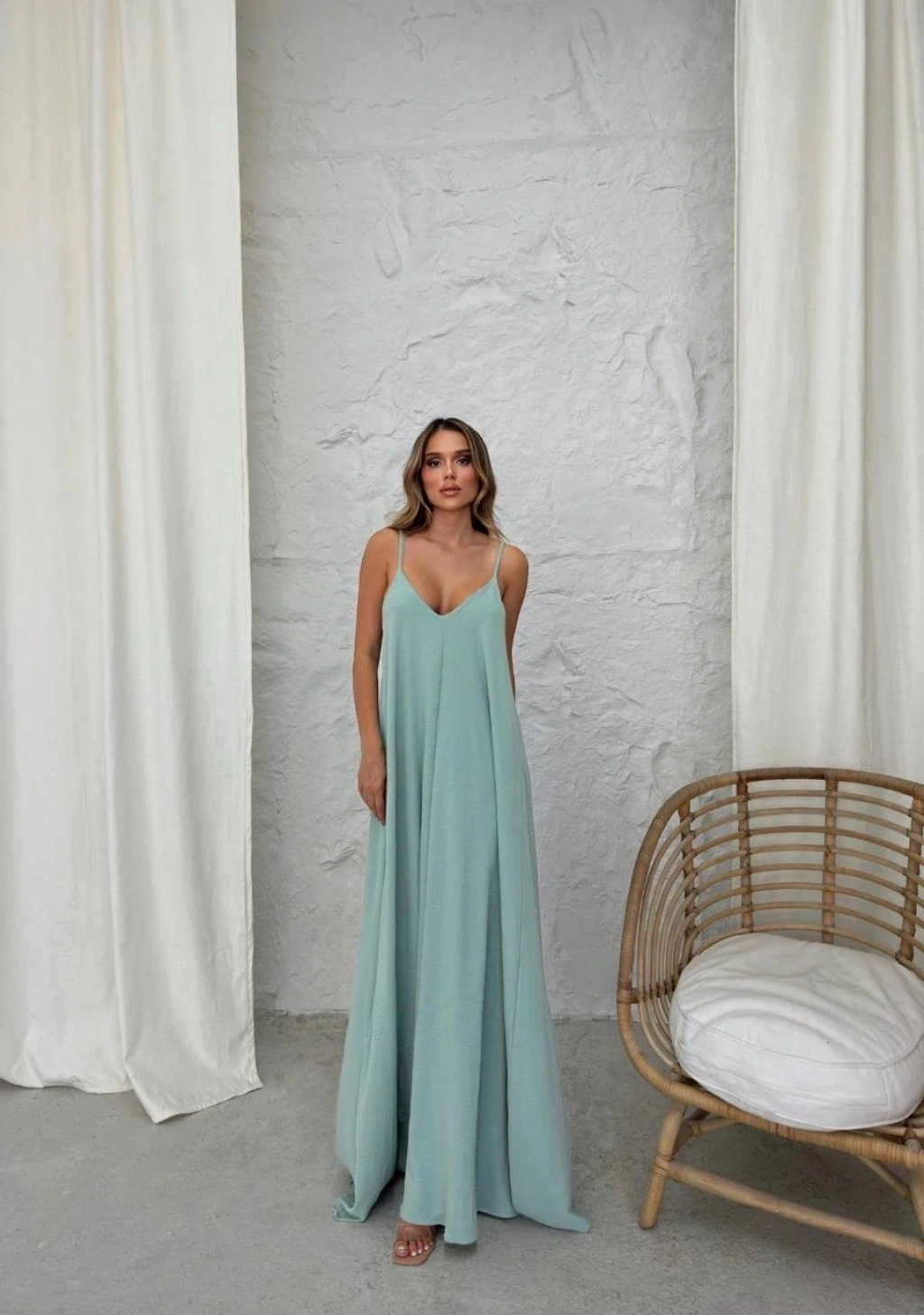 Aerobin uzun elbise, şıklığı ve rahatlığı bir arada sunan çağla yeşili rengi ile dikkat çekiyor.