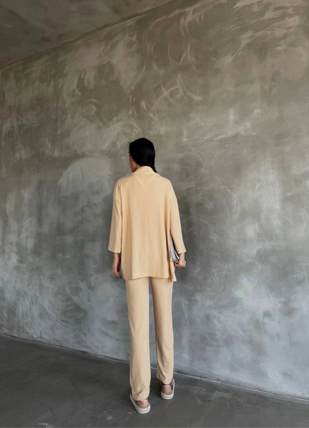 KAZAX markasının bürümcük kumaş yakımıyla tasarlanan kadın giyim takımı, şıklık ve rahatlığı bir arada sunuyor.