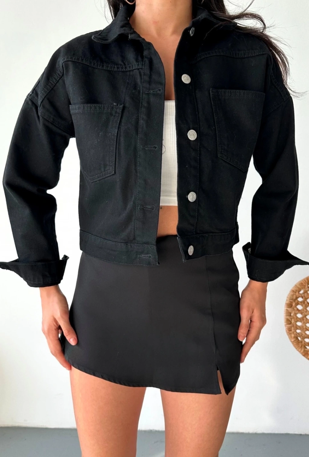 • Çift cepli kol katlamalı süper taş enzim yıkamalı crop kot ceket siyah d2000