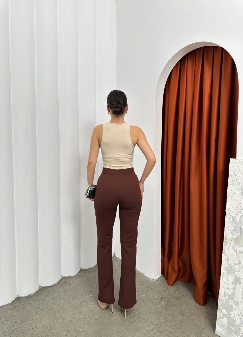 şık ve rahat tasarımıyla öne çıkan Düğmeli Palazzo pantolon kahve p170091, gardırobunuzun vazgeçilmezi olmaya aday!