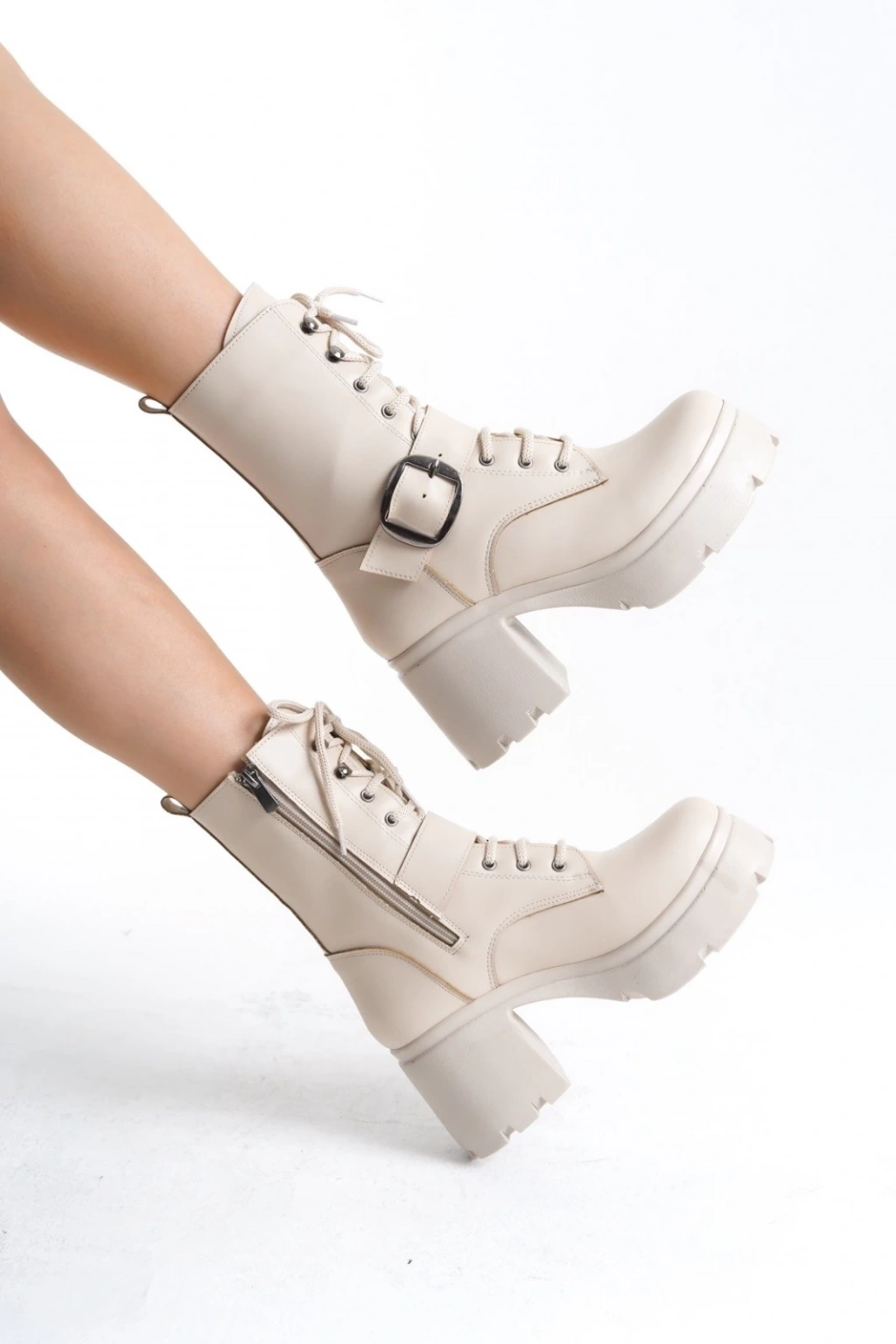 • Linma Bej Cilt Bağcıklı Topuklu Bot