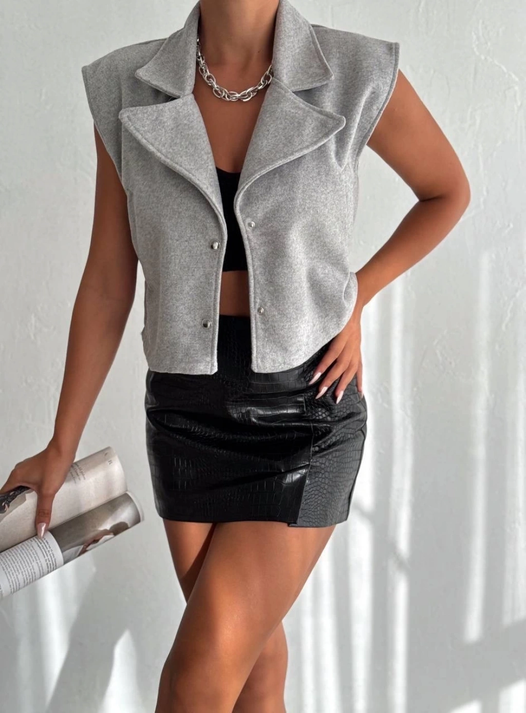 Önü çıtçıtlı cepli kaşe yelek gri F2253, şıklığı ve kullanışlılığı bir arada sunar.