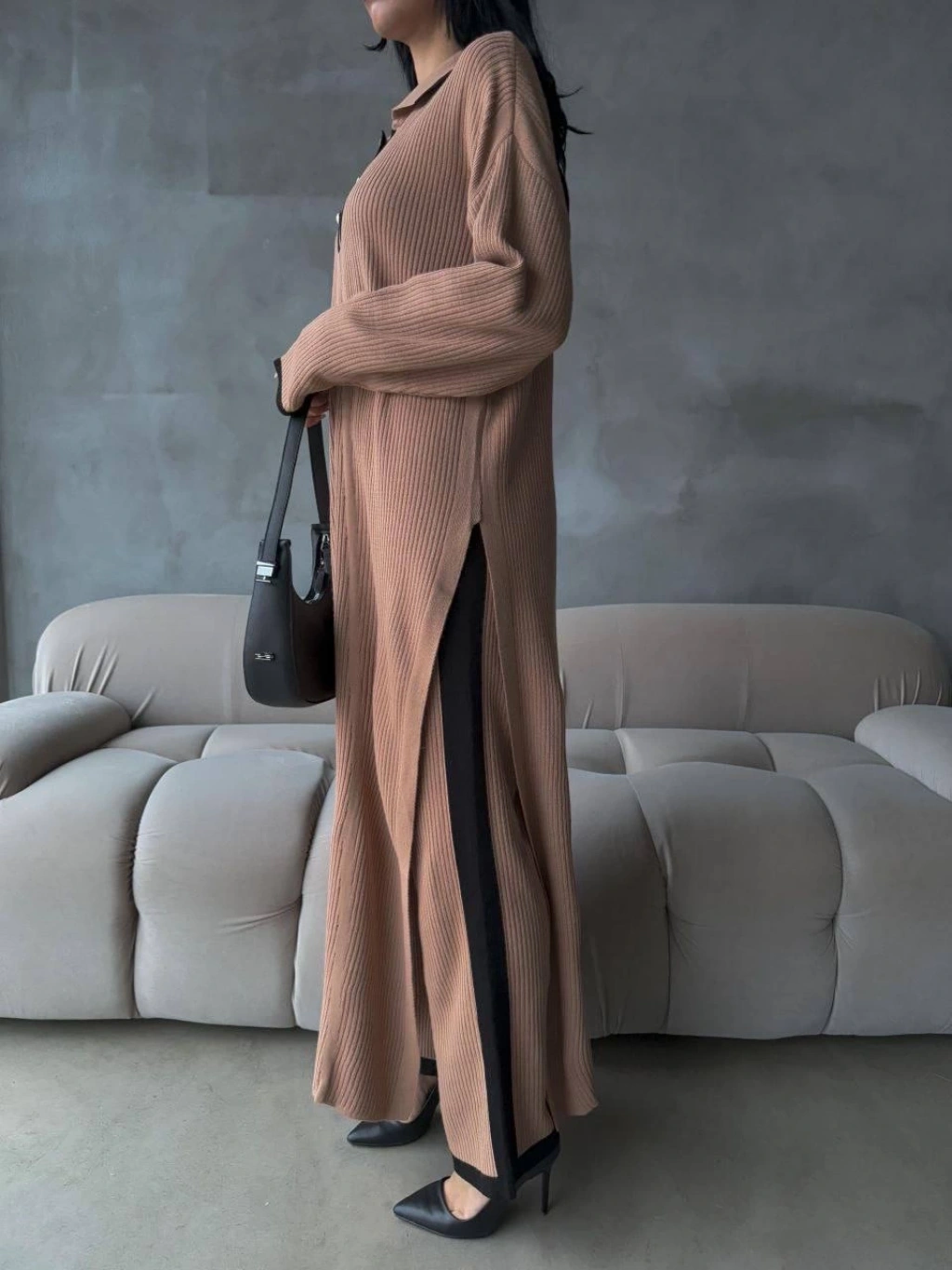 • Pantolon yırtmaçlı elbise ikili triko takım vizon elf