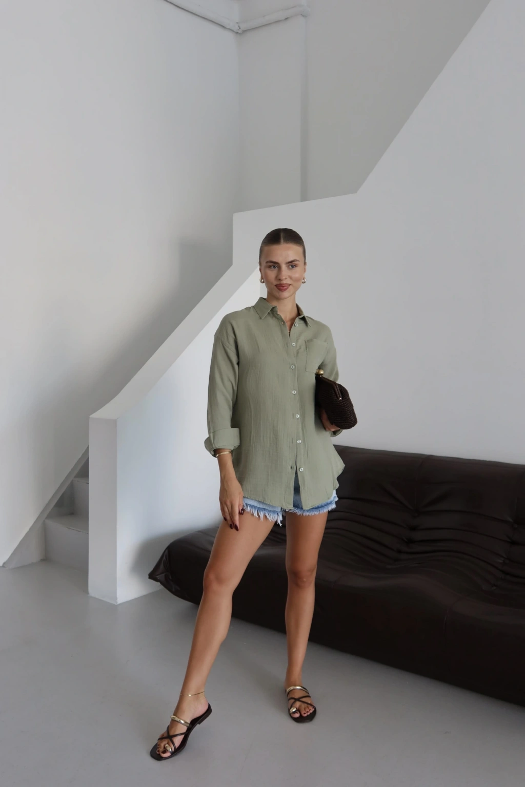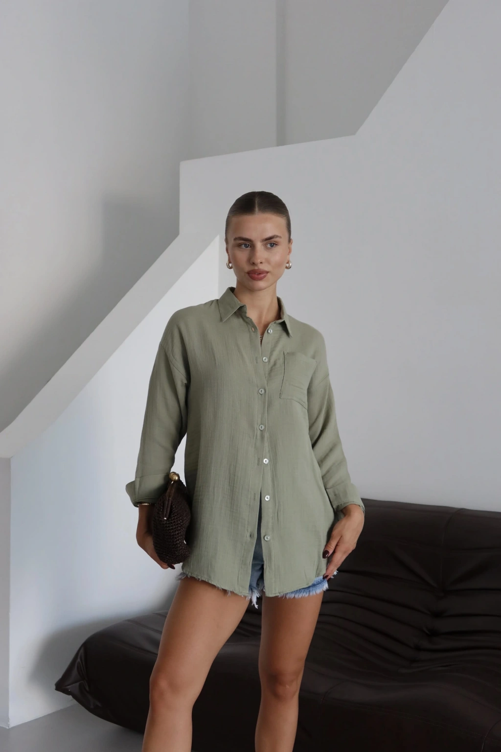 Bu haki rengiyle şıklığı ve rahatlığı bir arada sunan tek cepli müslin gömlek, gardırobunuzun vazgeçilmezi olmaya aday! Yuvarlak yakalı ve düğmeli olan bu gömleğin özellikleri şöyle: