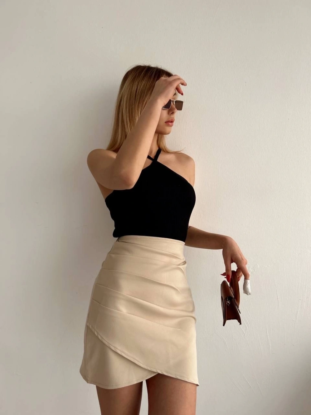 Yandan drapeli asimetrik etek bej s24771, gardırobunuza şıklık katacak bir parça.