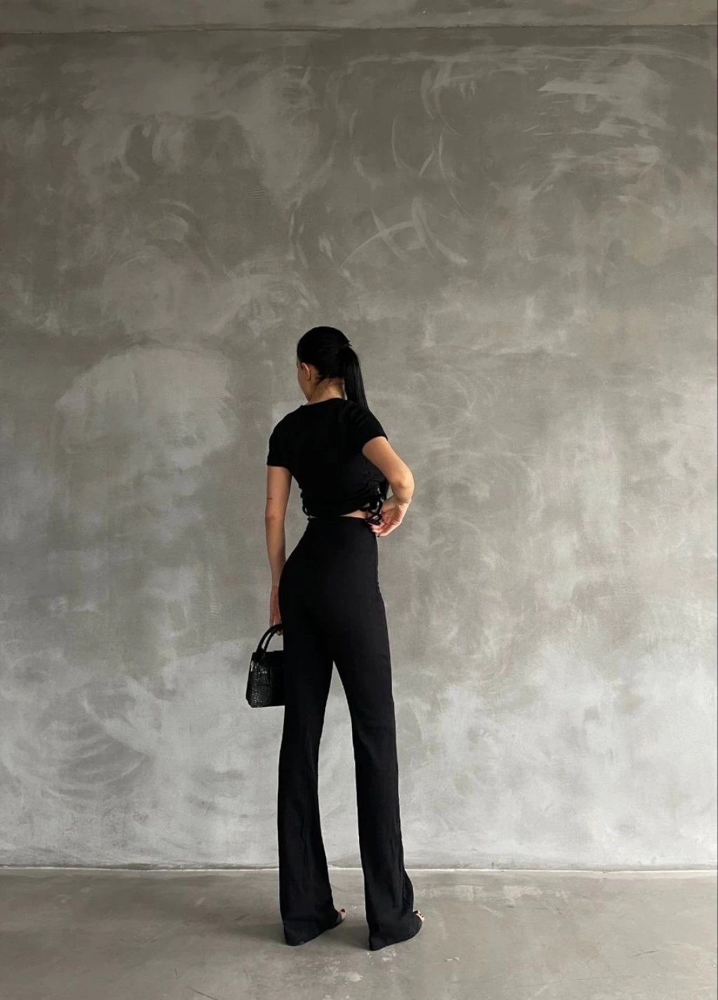 Yanları tünel detaylı pantolonu, uyumlu bluzu ile kombin tamamlar.