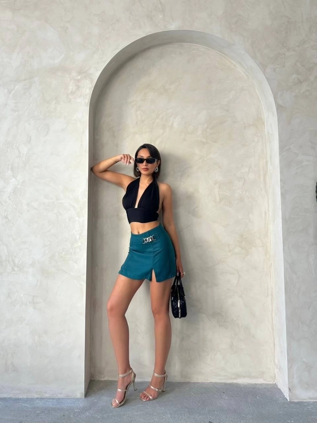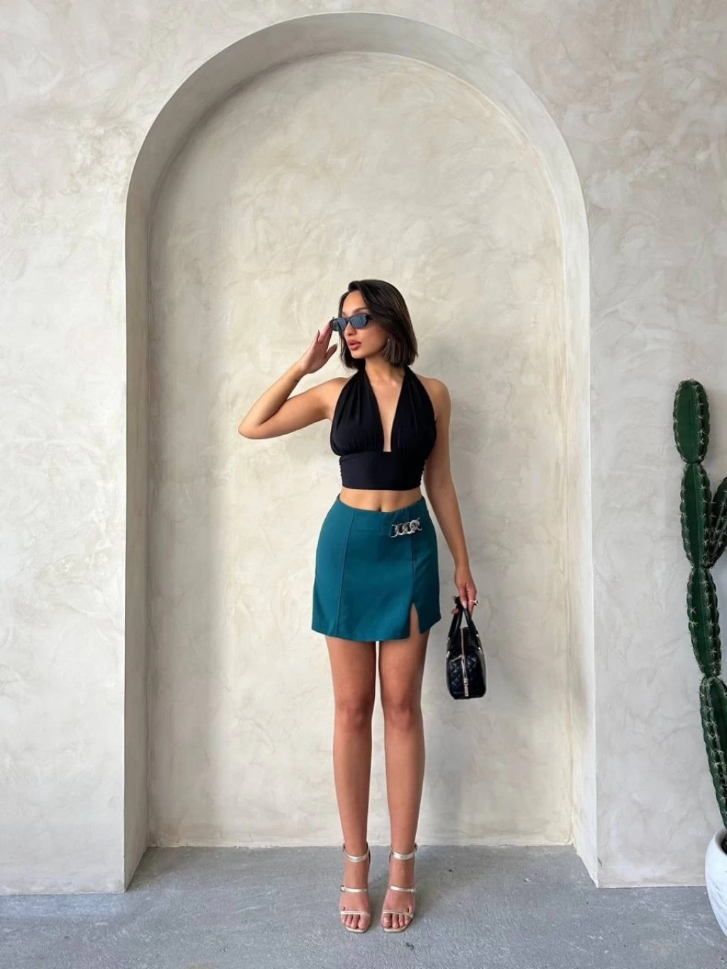 Sezonun trend parçalarından Zincirli Şort Etek S24676, şıklığı ve rahatlığı bir arada sunuyor.